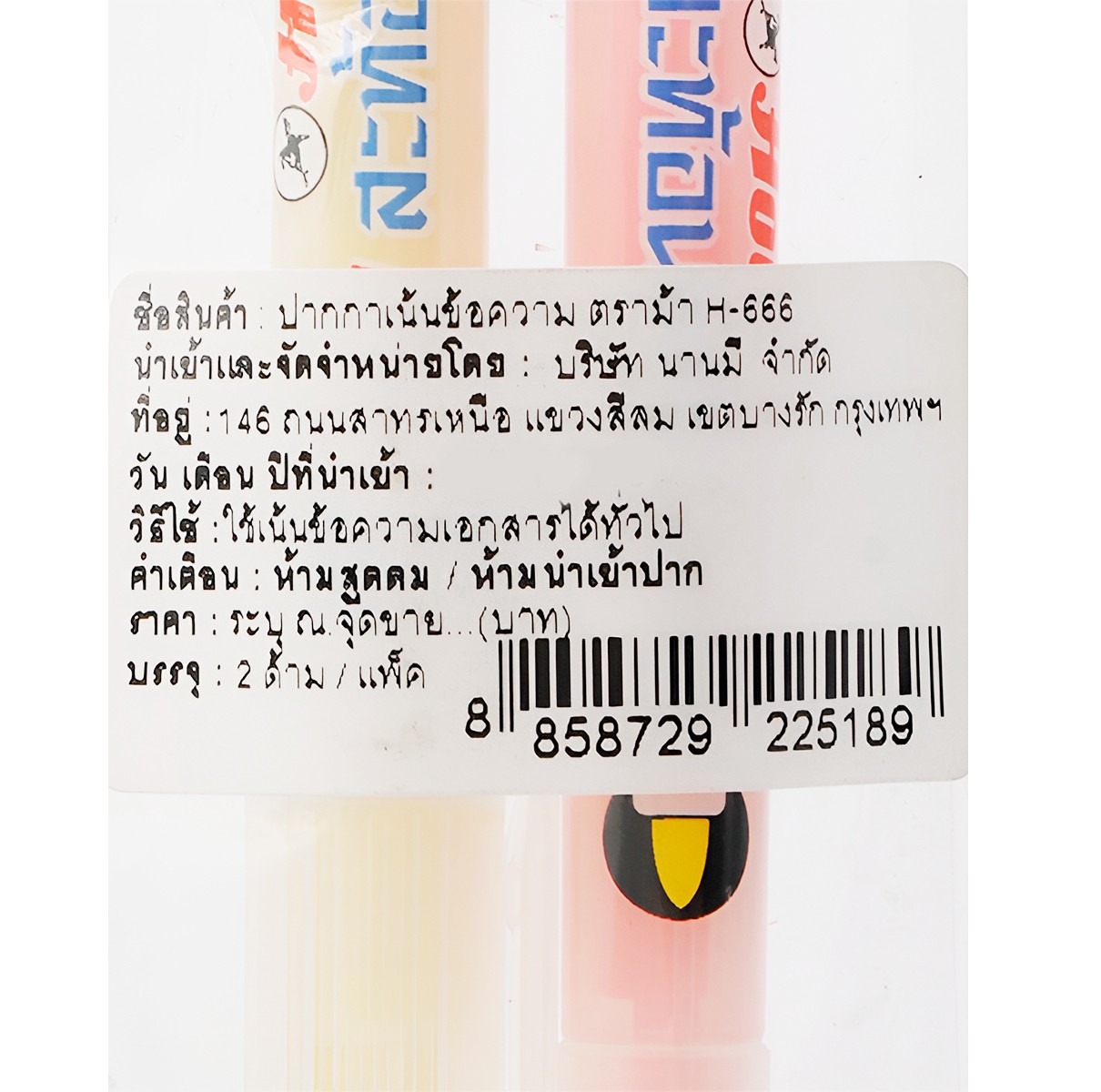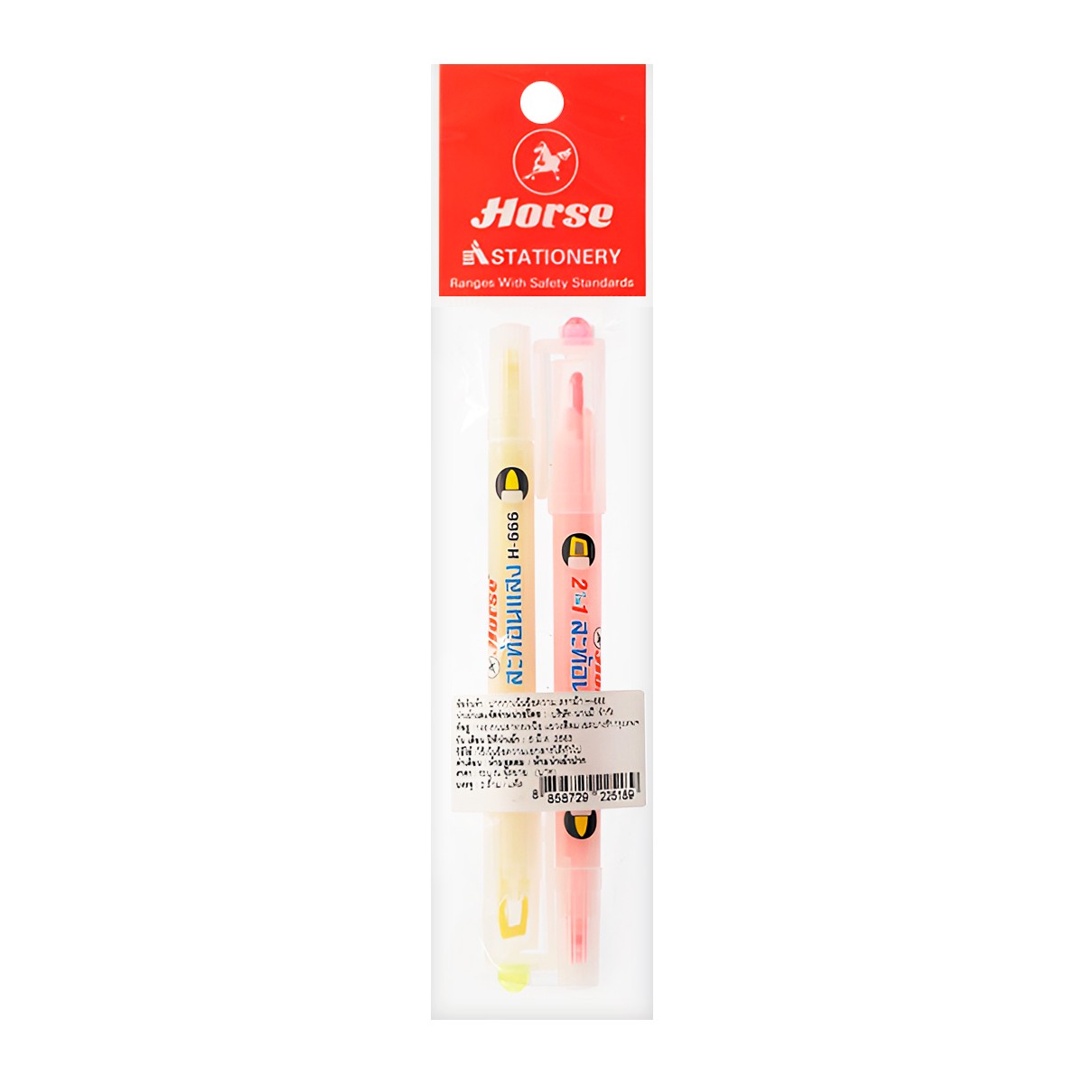 ตราม้า ปากกาเน้นข้อความ 2 หัว รุ่น H-666 ชนิดหัวตัดและหัวกลม ขนาดหัวปากกา 2-5 มม. สีสะท้อนแสงสดใส เน้นข้อความได้ชัดเจน สามารถใช้งานได้ทั้งกระดาษทั่วไป กระดาษถ่ายเอกสาร และกระดาษแฟกซ์ ไม่เกิดรอยเมื่อนำไปถ่ายเอกสารหรือส่งแฟ็กซ์