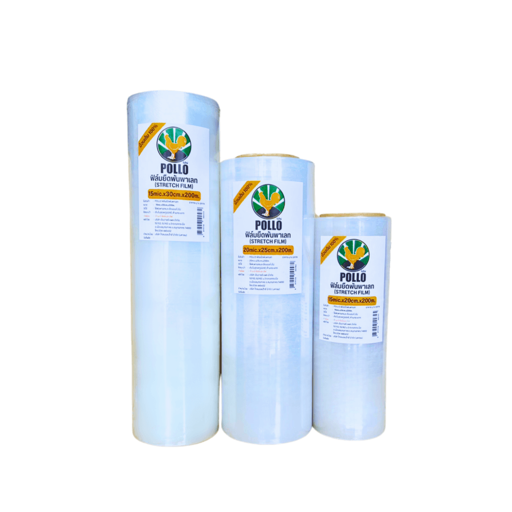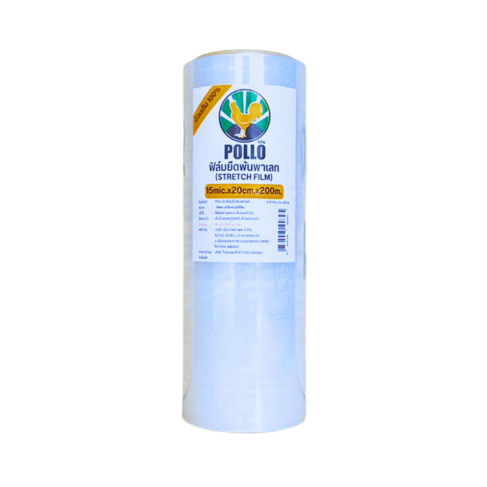 POLLO ฟิล์มยืดพันพาเลท 15 ไมครอน 20cmx200m. สีใส ยืดหยุ่น แข็งแรง ป้องกันฝุ่นและความชื้น เหมาะสำหรับพันพาเลทสินค้าทุกชนิด ราคาประหยัด ซื้อเลย!